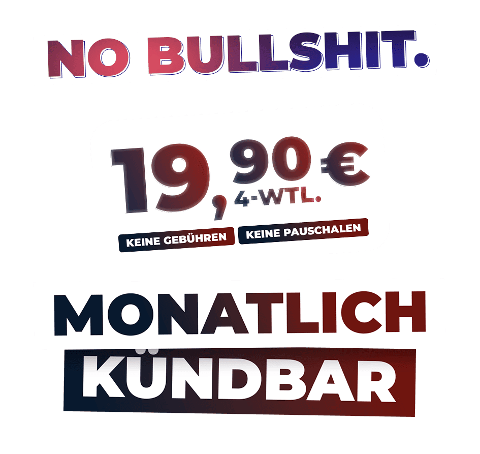 *MEGA DEAL 2026 - All-In - Sonderkonditionen für Neu-Vertrag: Mitgliedsvertrag mit unbeschränkter Lfzt.; ordentliche Kündigung mit Frist von 4 Wochen zum Monatsende; Leistungen nach Flexi-All-In-Mitgliedschaft. Start der Mitgliedschaft ab dem 1. des Folgemonats n. Vertragsabschluss. Reduzierter Mitgliedsbeitrag i. H. v. 19,90 EUR/ 4-wtl. (insg. 13 Abrechnungszeiträume/ Vertragsjahr). Die Kosten für die Vorabnutzung bis Beginn der regulären Mitgliedschaft entfallen. Die Startgebühr in Höhe von EUR 89,00, die Kosten für das Trainingspaket in Höhe von EUR 24,80 und die Kosten für das Servicepaket in Höhe von 19,00 EUR/alle 26 Wochen entfallen. Ergänzend gelten die Allgemeinen Geschäftsbedingungen von wellyou. Alle Preise inkl. gesetzl. MwSt.